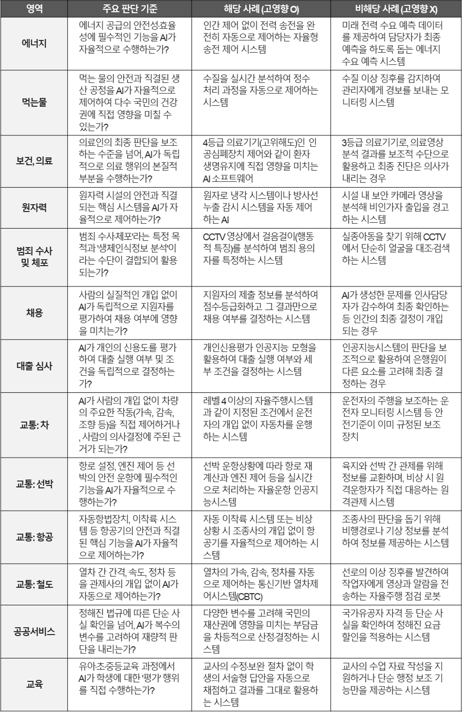 가이드라인은 각 영역별로 고영향 AI를 판단하는 주요 기준과 사례를 공개하고 있습니다. 다음은 가이드라인 내용의 핵심을 요약하여 정리한 표입니다.
