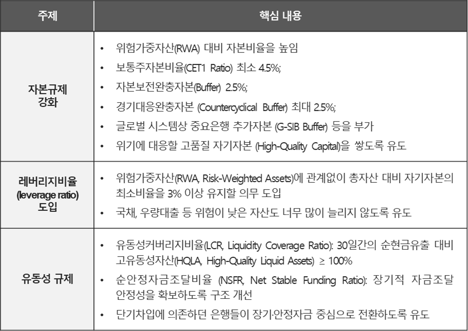 2008년 글로벌 금융위기 당시, 많은 은행들은 높은 부채비율, 부실한 자본구조, 부족한 유동성으로 인해 도산하거나 구제금융을 받게 되었습니다. 이러한 취약성을 보완하기 위해 국제결제은행 (BIS, Bank for International Settlements) 산하의 바젤은행감독위원회(BCBS, Basel Committee on Banking Supervision)는 2010년 이전 체계(바젤II)의 규제를 전면 강화하여 바젤 III를 도입하였습니다.
