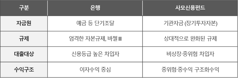 기존 은행과 사모신용펀드의 주요 차이점은 다음과 같습니다.