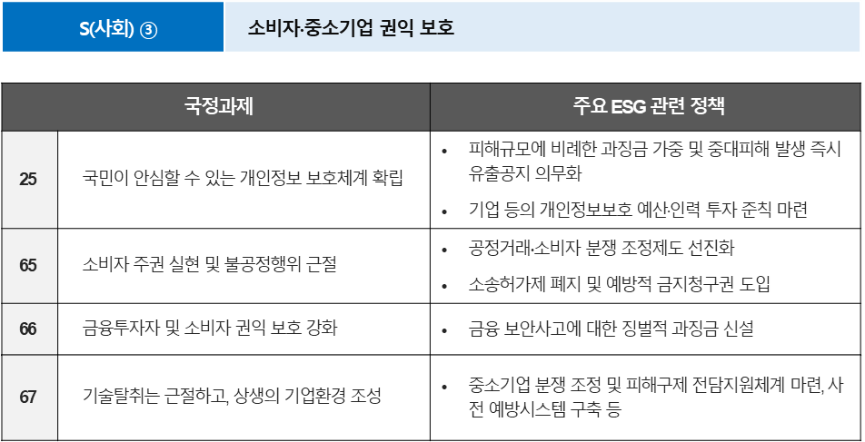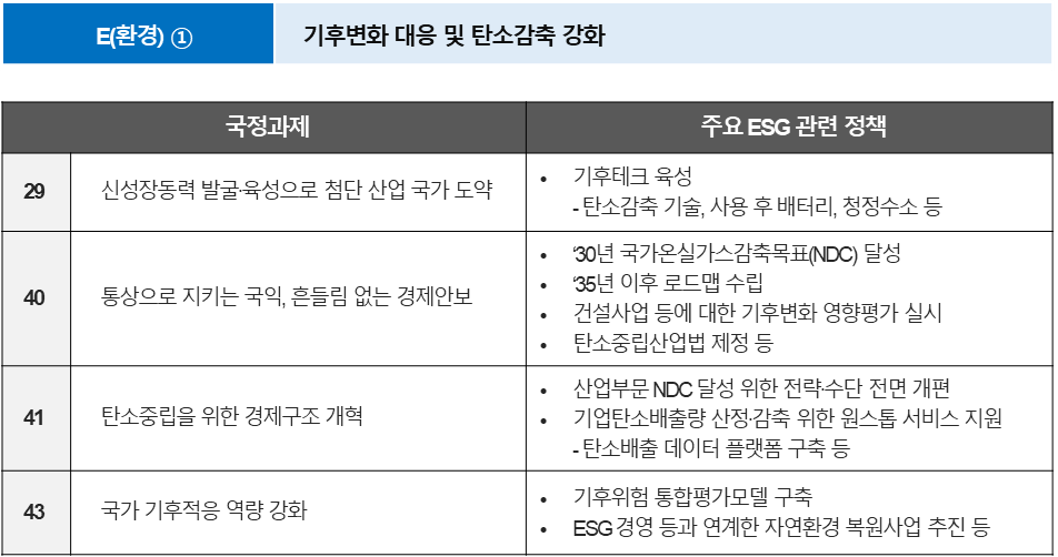 이재명 정부가 향후 5년간의 국정 운영방안을 국무회의를 통해 확정하고 지난 9월 16일에 발표했습니다. 이번에 발표된 국정 운영방안에는 ‘국민이 주인인 나라, 함께 행복한 대한민국’이라는 국가비전 아래 5대 국정목표, 23개 추진전략, 123개의 국정과제가 포함되었으며, 전체 123대 국정과제 중 27개(21.3%) 과제가 ESG 정책과 관련성이 있는 것으로 분석되었습니다. 1 본 이슈 브리핑에서는 이재명 정부 국정과제 중 ESG 관련 주요 과제들을 9개의 정책 테마로 분류하고, 각 테마별로 정책∙법제화 전망과 기업 영향을 살펴본 후 기업 대응방안을 제시하고자 합니다.