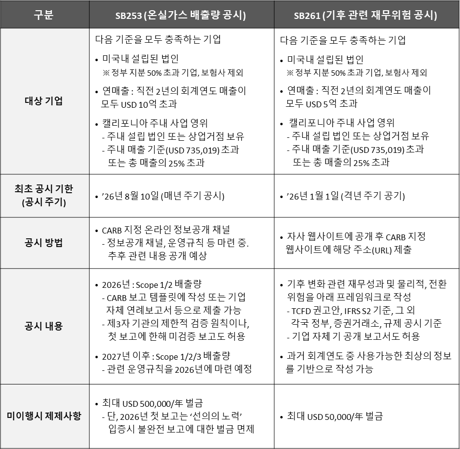 온실가스 배출량 공시(SB253) 관련 첫번째 보고서 제출기한이’26년 6월 30일에서 ’26년 8월 10일로 변경되었습니다. 기후 관련 재무위험 공시(SB261) 첫번째 보고서 제출기한은 ’26년 1월 1일로 기존과 동일합니다.