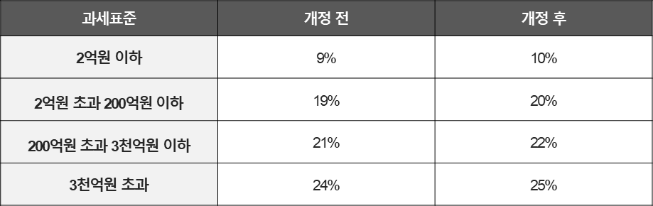 • 법인세율을 각 과세표준 구간별로 1%씩 상향함(법인세법 제55조 제1항 개정).