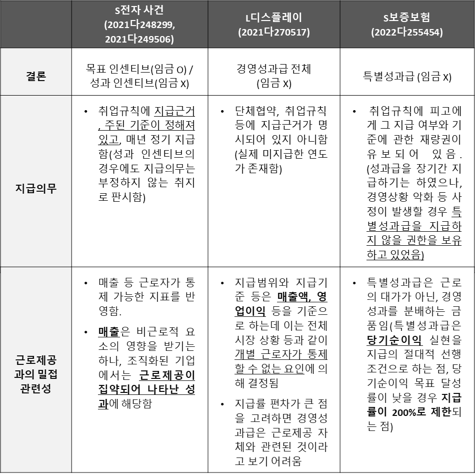 대법원은 같은 날 선고된 L디스플레이 사건과 S보증보험 사건에서도 모두 경영성과급의 임금성을 부정하였는데 세 사건의 주요 내용을 비교하면 아래 표와 같습니다.