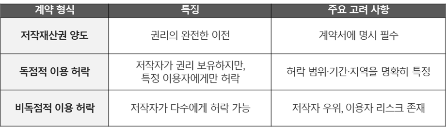 저작재산권 양도, 독점적 이용허락, 비독점적 이용허락 중 어떤 계약 형식을 선택할지는 사업 구조와 리스크 관리 전략에 따라 달라집니다.