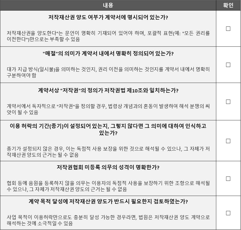 이번 판결에서 법원이 직접 검토한 사항들을 중심으로, 게임 음원 계약 체결 또는 검토 시 확인해야 할 핵심 항목을 정리하였습니다.