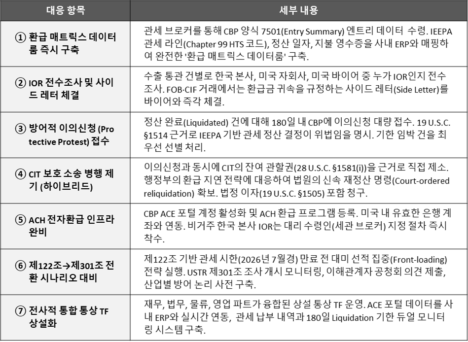 트럼프 행정부가 환급을 최대한 지연시키려는 태도를 보이고 있어 행정적 이의신청만으로는 환급이 지연될 수 있습니다. 미국 국제무역법원(CIT)을 통한 사법적 강제 명령(Court-ordered reliquidation)을 확보하는 방안을 검토해야 합니다.