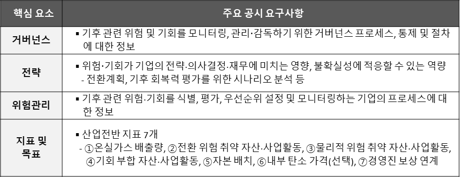 공시기준서 제1호와 제2호는 TCFD 권고안 및 ISSB 기준과 동일하게 거버넌스, 전략, 위험관리, 지표 및 목표의 4대 핵심요소를 중심으로 공시를 요구합니다. 특히 제2호는 기후 관련 위험·기회에 대한 전환계획, 시나리오 분석, 온실가스 배출량(스코프 1/2/3) 등 구체적이고 정량적인 정보 공시를 요구하고 있어, 기존 자율공시 수준을 넘어서는 체계적 대응이 필요합니다. 핵심요소별 주요 공시 요구사항은 다음과 같습니다.