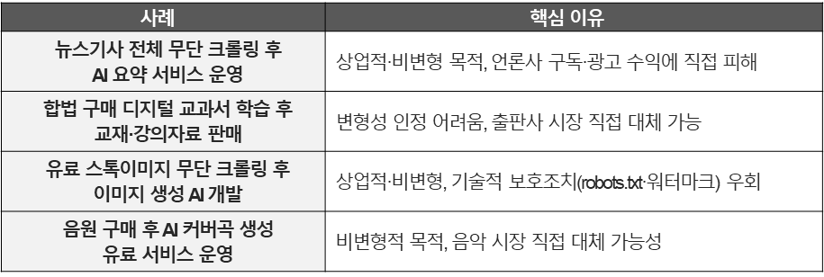 • 불리한 경우: 원저작물의 문장·구성·표현을 실질적으로 동일하거나 유사하게 재현하는 경우, 접근이 제한된 저작물(유료 구독, 로그인 필요)을 무단 수집한 경우, robots.txt 등을 통해 수집이 금지된 저작물을 무단 수집한 경우