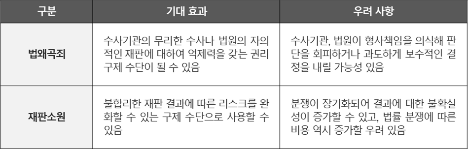 법왜곡죄와 재판소원은 일반적인 불복 수단이 아니라, 수사∙재판 과정이 정상적인 범위를 벗어났을 때를 대비한 견제 장치입니다. 즉, 이미 결과가 발생한 사건에 대하여 사후적으로 활용을 검토하는 것이 아니라, 향후 발생 가능한 문제 상황을 염두에 두고 수사 및 재판의 전 과정에 걸쳐서 사전에 대비하는 관점이 중요합니다.