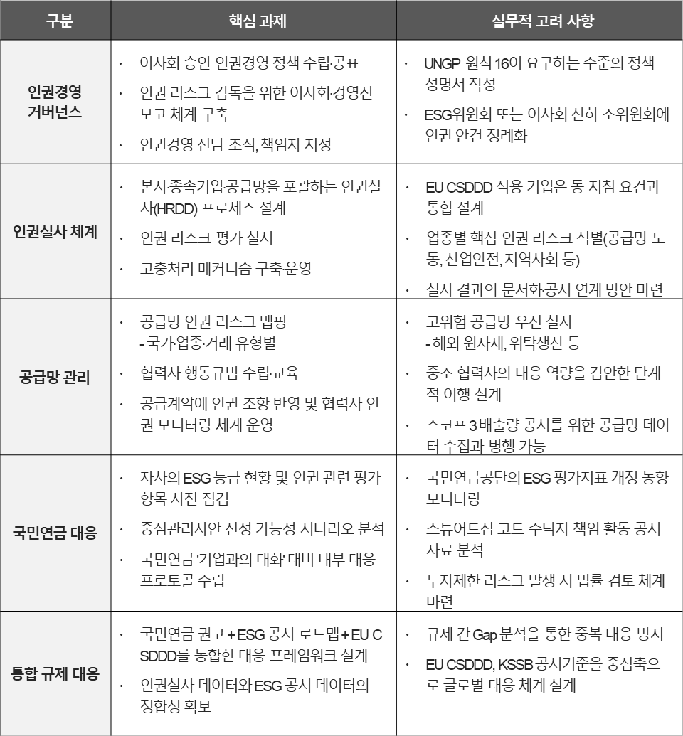 마지막으로, 복수 규제에 대한 통합 컴플라이언스 체계를 구축해야 합니다. 국민연금 권고, ESG 공시 로드맵, EU CSDDD 역외적용 등이 동시에 진행되고 있으므로, 인권실사 데이터와 공시 데이터의 정합성을 확보하고 규제 간 Gap 분석을 통해 중복 대응을 방지해야 합니다.