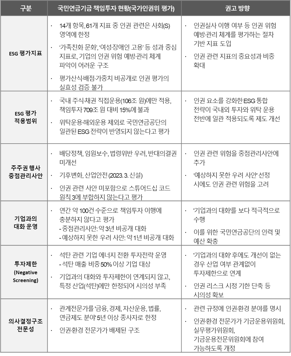 국민연금공단은 자체 ESG 평가를 통해 상장사를 6등급(AA~D)으로 분류하고, 하위 등급 기업에 대해 추가 투자를 제한하는 방식으로 ESG 통합 전략을 운영하고 있습니다. 그런데 현행 평가지표 61개 중 인권 관련 항목은 '가족 친화 문화', '여성·장애인 고용', '노사문화 우수기업' 등 결과 지표로 구성되어 있습니다. 국가인권위는 이러한 지표로는 기업이 인권 위험을 사전에 식별, 예방, 관리하기 위한 체계와 절차를 갖추고 있는지를 파악하기 어렵다고 보았습니다.